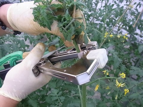 いい方法がないか調査していたら、テープナー(マックス誘引用結束機)といういわゆるホッチキスのおばけと結束用のテープが一体になったものがあり、トマトの誘引にも使える事がわかり、早速購入。