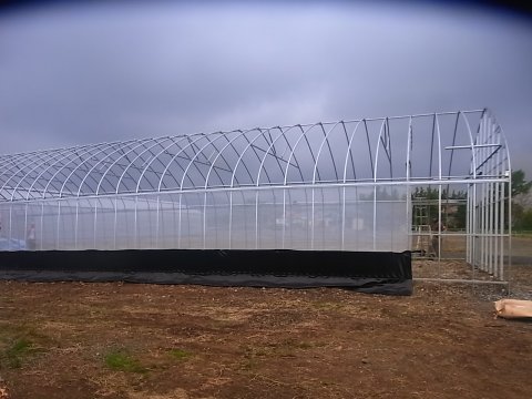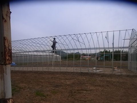 ずいぶん形になってきました。 もうすぐ工事完了の雰囲気です。 ハウスの峰部分に等間隔で入っている三角の骨材は構造補強のためのトラス構造です。 これがあると無いとでは強度に大きな差が出ます。 写真の前後方向/上からの圧力が加わった場合に、その力が発揮されます。 要するに「変形しにくい」ということです。 風や雪による力に対抗するための有効な手段です。