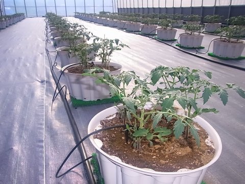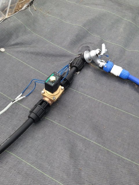 定植が完了し、苗が小さいうちは散水ホースで水やりをしていましたが、自動灌水用のパイプ資材が届いたので、早速配管作業開始です。 ポリパイプを専用継ぎ手でジョイントし、根本に電磁弁を直列に取付、その後4ラインに分岐し点滴灌水用ノズルを接続して終了です。 今回は4列×20鉢で、すべて同一品種(チェリーゴールド)ですので、電磁弁は根本に1つのみの取付です。 次は管理用のPCの設定を行います。