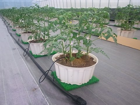 定植から3週間経過しました。 5/22に定植した苗はしっかり根付き、順調に生育しています。 本葉は10枚程度で一番花が開花し始めています。 順調に生育すれば、7月の後半に収穫が開始できる見込です。 写真で見てお気づきかと思いますが、誘引用の棚が現段階ではありません。 急いで組み上げないと、トマトの生長に負けてしまいます。 100坪ハウスの管理と平行しての作業となるため、大忙しです。