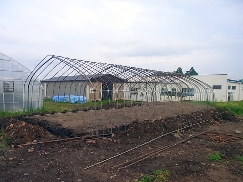 まだ、パイプを立てるところまでしか進んでいませんが、雨が降る前に被覆フィルムをかけてしまいたいのですが、ちょっと今日は無理でした。