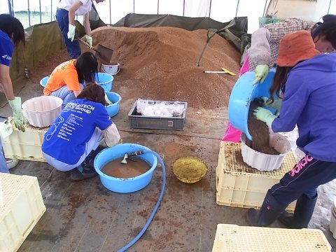 社員の協力でポット一つに入れる各種肥料を計量し、成分調整した基本土(写真の奥に見えている土山)と十分に混和しポットに移していきます。