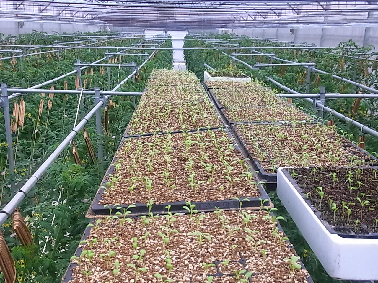 今、レタスの苗はギャラクシー(100坪ハウス)のおなじみのトマト栽培棚の上に置かれており、毎日おひさまのエネルギーを浴びて元気いっぱいに育ちつつあります。