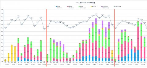 下のグラフは各月上旬/下旬のサイズ別収穫重量と1株あたりの収穫重量となります。