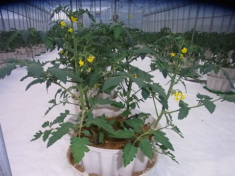 40坪ハウス(イーハトーブ)で栽培中のミニトマトですが、順調に生長しており、1段目が花盛りで2段目も開花しています。