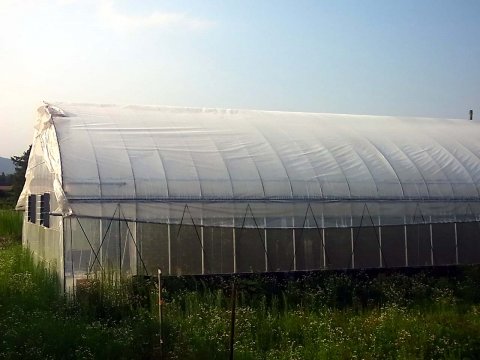 流石にこのくらいの温度になるとトマトにも生育障害が生じますので、予防策として遮光目的でハウス外側に消石灰を水に混和し動力噴霧器で吹付けしました。