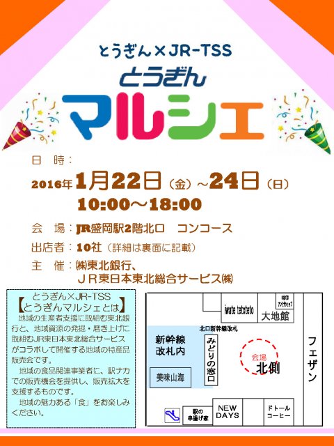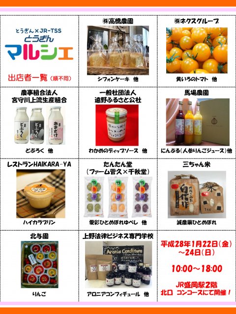 1/22~24の期間、岩手県盛岡駅2F北口コンコースにて「とうぎんマルシェ」に出店いたします。 岩手県内のネクスファームほか9社が参する特産品販売会です。 皆様のご来場を心よりお待ちしております。