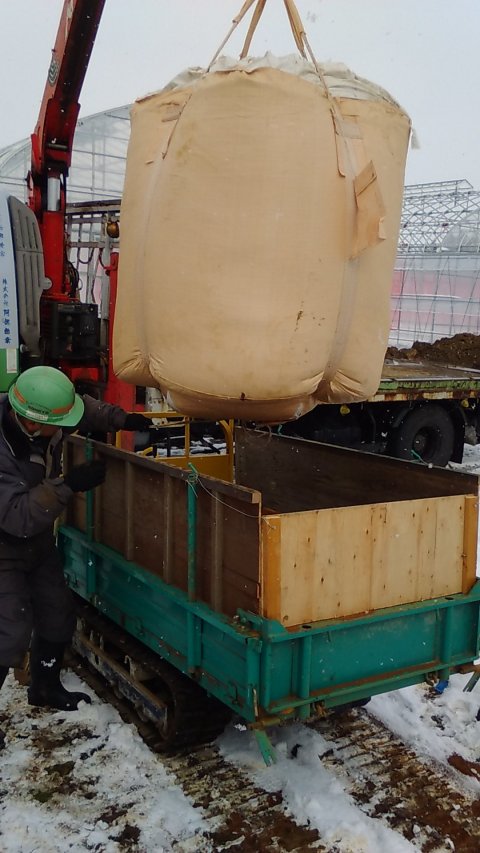フレコンで納品されますので、一旦運搬車に土を積み込み、作業場所に運搬、一時保管します。