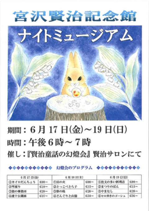 また、6月17日(金)~19日(日)の18時からは、宮澤賢治記念館 賢治サロンで、ナイトミュージアム「賢治童話の幻燈会」も開催されます。