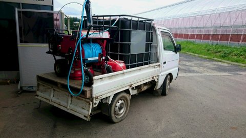 軽トラックの荷台に1t容量のタンクをのせハウス間を自由に移動できます。