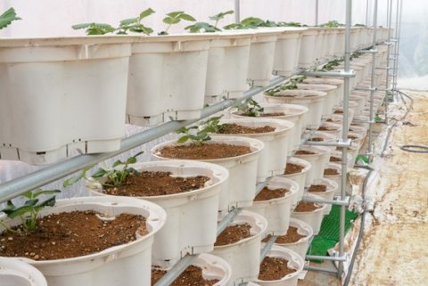 試験棟のハウスでは、試験的にイチゴの栽培を始めています。