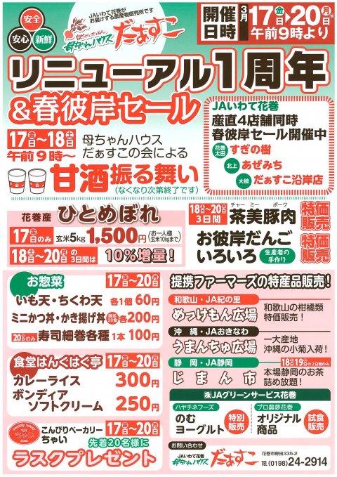 今週末の三連休にかけて3月18日は、イトーヨーカドー花巻店内にあるマイスター&アカトーで、3月19日と20日はJAいわて花巻 母ちゃんハウスだぁすこ様で行ないます。