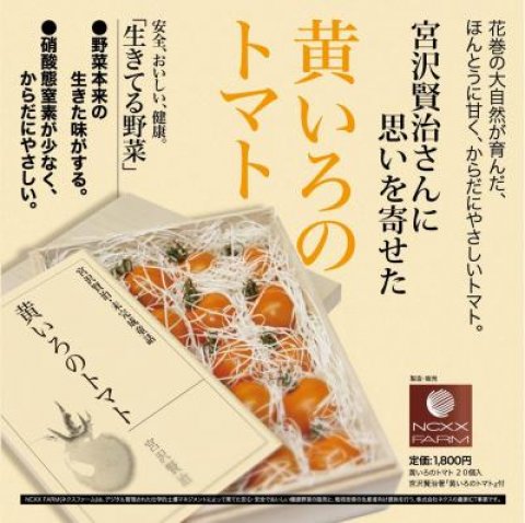 システムと特許農法により生まれた高品質、高糖度の色鮮やかな黄いろのミニトマトの中から、大きさ、色、ツヤ、形にいたるまで最高級の品だけを手作業で選別、20粒の珠玉のミニトマトが特製の桐箱のなかにやさしく包まれており、宮沢賢治の童話「黄いろのトマト」が同梱されています。