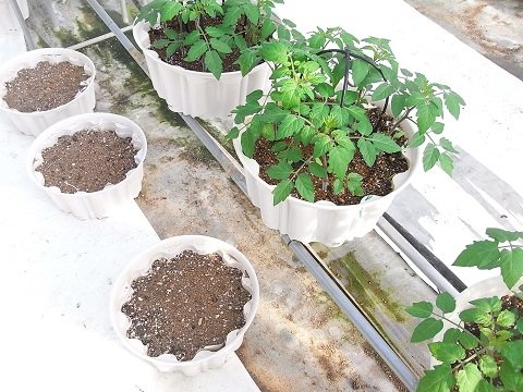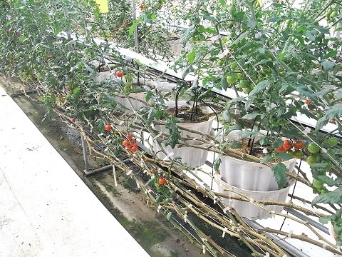 現在、5棟のハウスが定植時期であったため、苗を植えたばかりでポットが1段の状態と、収穫中で数メートルにも株が伸びた2段のポットの状態の、2通りの状態を見せながら説明を行いました。
