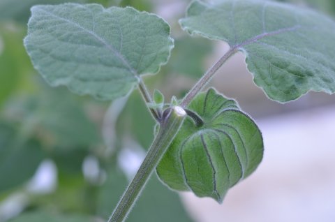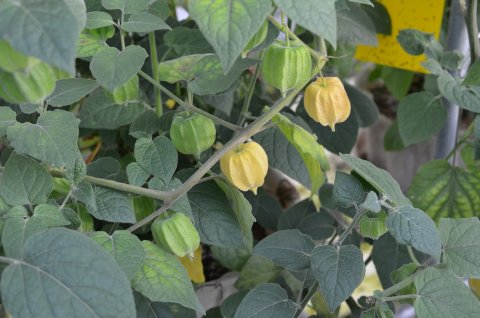 9月に定植した食用ほおずきの袋状の萼(がく)が黄色みを帯びてきました。