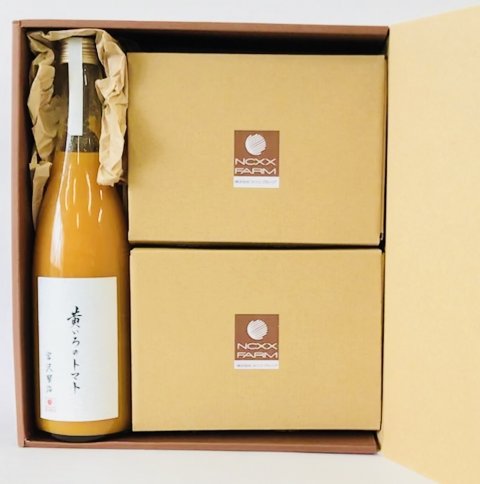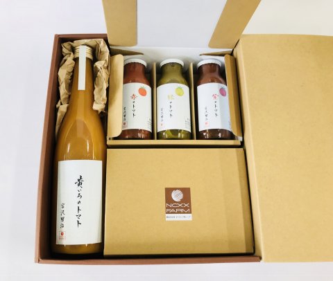 黄いろのトマト100%ジュース 720mlが1本と各色(黄いろ・赤・緑・紫)トマト100%ジュース 180mlの3本セットが2箱入ったギフト商品です。