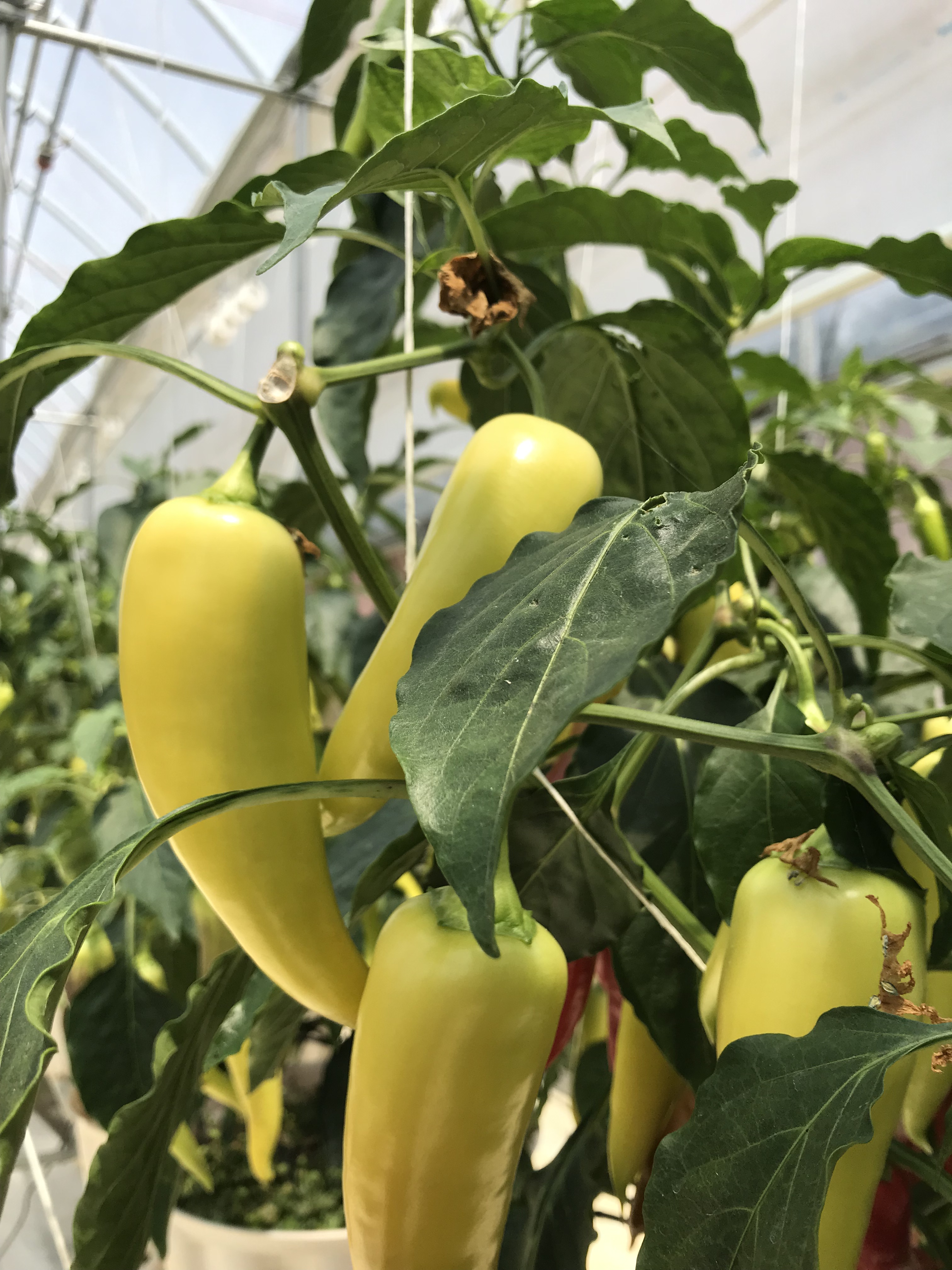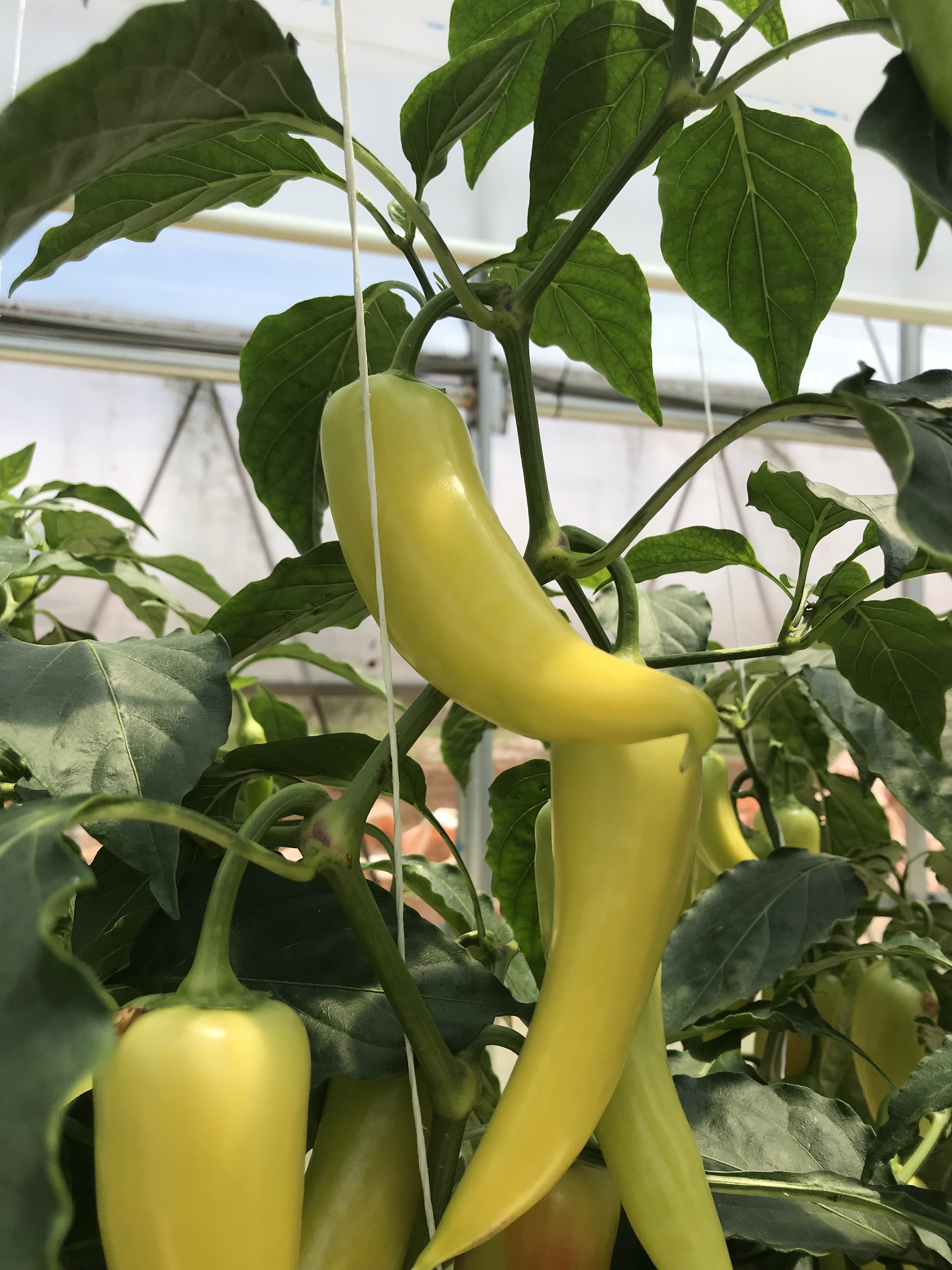 バナナピーマンは淡い黄緑色の細長いピーマンで、普通のピーマンほど苦味がなく、ほんのり甘みが感じられます。通常売られているものは黄緑色の状態のものがほとんどですが、熟すにしたがって黄緑色からクリーム色へ、そして黄色からオレンジ、完熟すると鮮やかな赤色になります。又、その色と形がバナナへ似ている事から名づけられた野菜です。