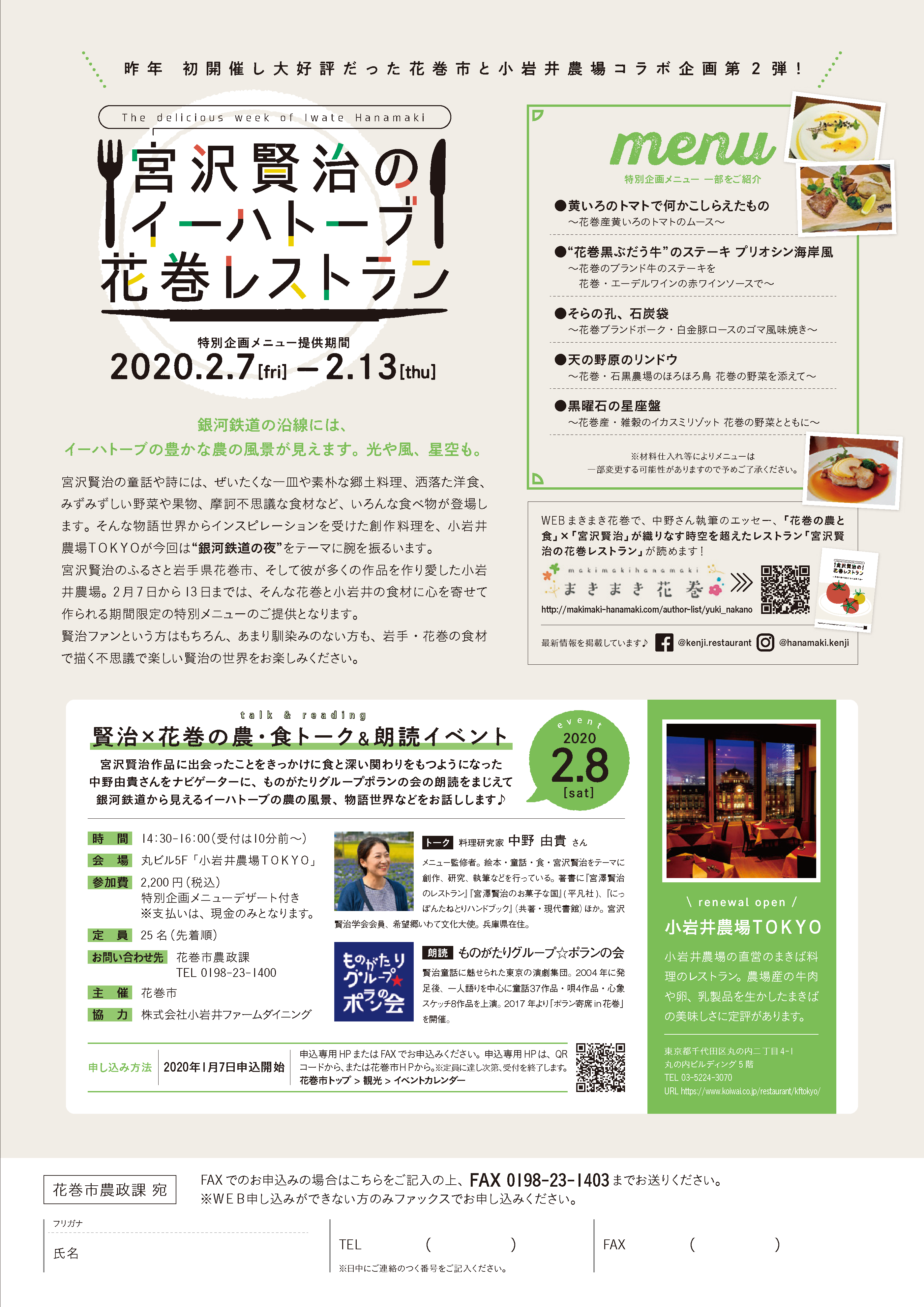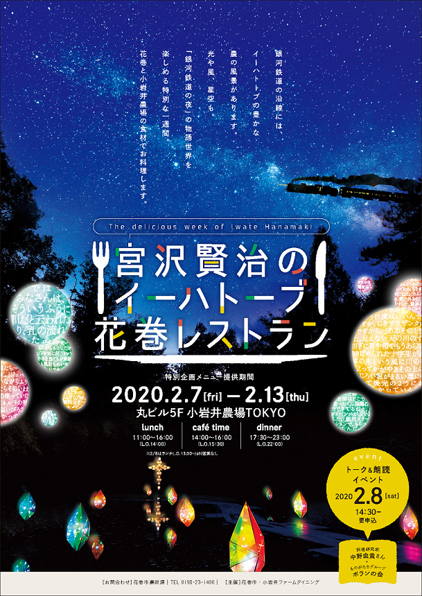 令和2年2月「宮沢賢治のイーハトーブ花巻レストラン」が東京都丸の内で開催されます!