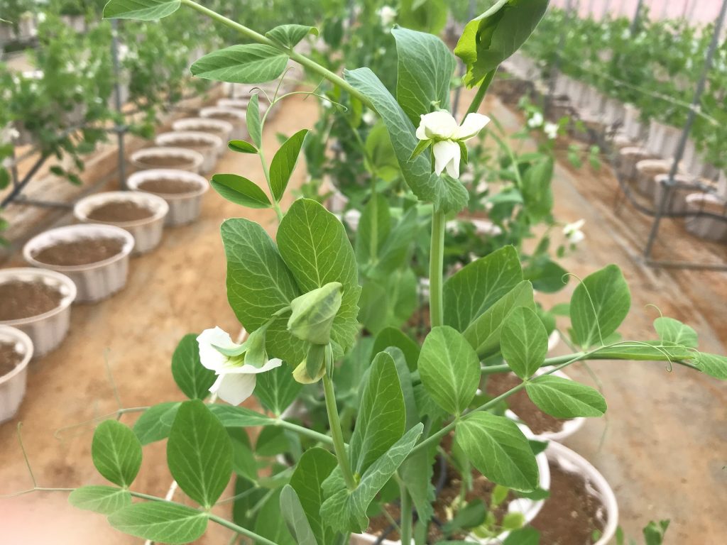 ビニールハウス栽培を始めたスナップエンドウが順調に成長しており、花が咲き始めました。