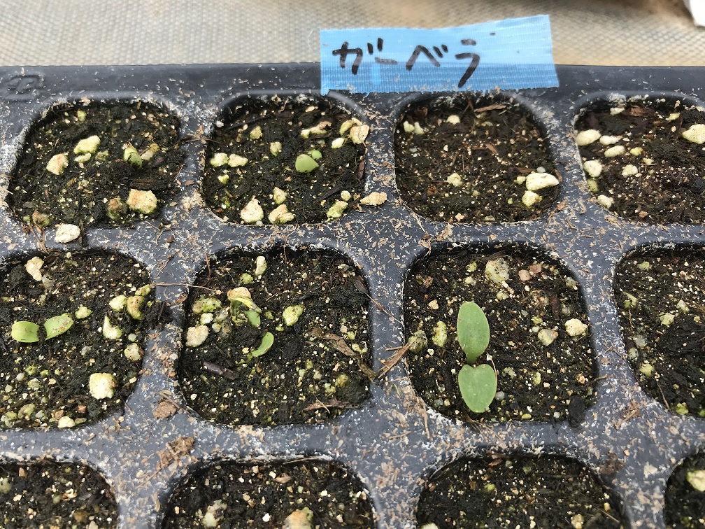 また、試験ビニールハウスではサルビアとガーベラの種をまき、やっと芽を出し始めた状況です。