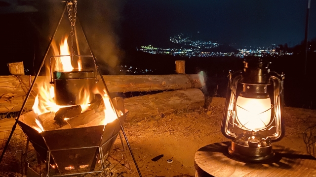 ランタンと焚火で食卓を囲むと暖かさも倍増です。是非お試しください。