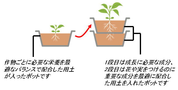 畑を必要としないポットによる栽培法ですので、作物に合った難しい土壌改良や、追肥、除草などの面倒な作業を軽減すること が可能となります。また、作付けごとに新しい用土を使用しますので、連作障害が生じません。専用用土には約6ヶ月分の収穫 が可能な肥料があらかじめ配合されており、栽培途中での追肥も必要ありません。