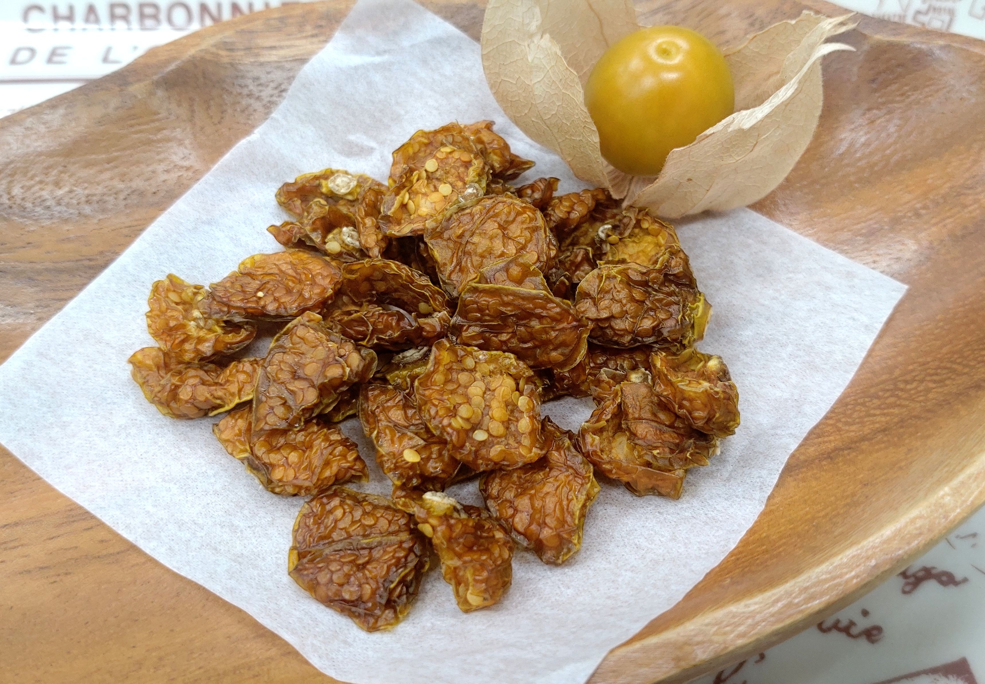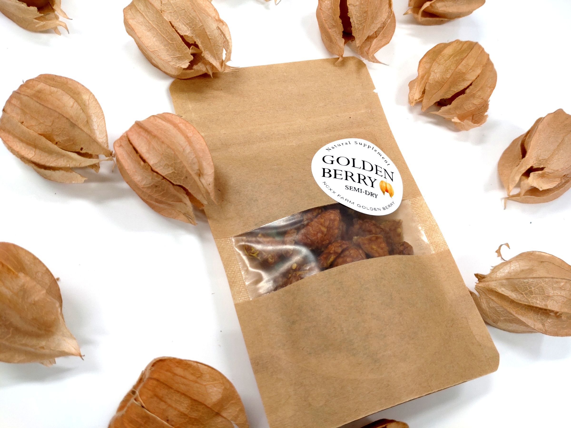 ネクスファームで獲れたゴールデンベリーをカットして乾燥、風味と栄養がギュギュっと凝縮されたセミドライゴールデンベリーです。