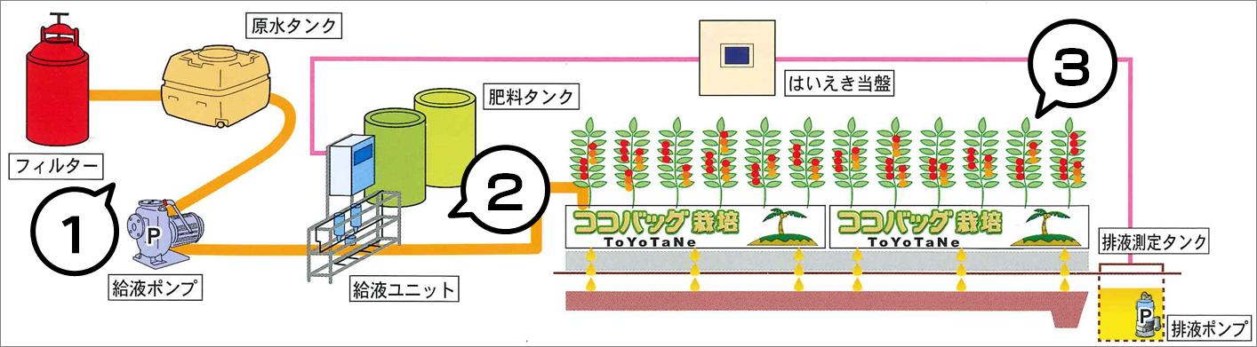 給液ユニットを使い、給液時間、給液量、給液回数、肥料濃度等を設定して管理を行います。給液はドリッパーによる少量多回数給液です。また、「はいえき当盤」制御盤(オプション)は給液量を制御して適切な排液量に調節します。 |