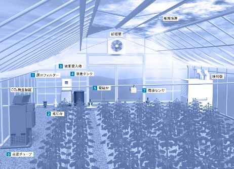 (原水フィルター、減圧弁、液肥混入機、液肥タンク、電磁弁、点滴チューブ)